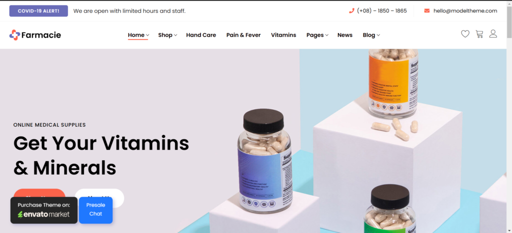 Farmacie’ is a purpose-made WordPress Theme to showcase online drug stors and online pharmacies. The design invites your clients to trust you, your methods, and equipment over any other. It bundles a clean and user-friendly layout, booking appointments, woocommerce compatibility and more.